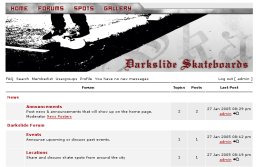 It uses phpBB for the forums, and Gallery for the photo album; two excellent open source web apps. Of course it's all tied together to look like the same site with various small graphical and code tweaks by yours truly and a top notch site banner by Jason. I originally kicked one out but it looked like I had completely ripped off somebody elses phpBB site banner and slapped "Darkslide Skateboards" on it. It probably didn't help matters that this was excatly what I had done, but Jason stepped up to the plate and hooked a brotha up with a professional quality one that was actually original to boot.