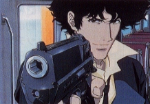 see, like six months or so ago i became aware of a little anime series with an interesting name. when i'd see dvd's of it sitting on shelves at hastings', i noticed that the cover artwork was rather stylish but i wasn't going to be fooled by that. there's far too much crappy anime out there hiding behind interesting names and cool cover art. but then a friend of mine passed me an mp3 of a song from the soundtrack of this series and i was definitely intrigued. it was... stylish. kind of jazzy. not shit. and it seemed strange that what i saw on the cases and what was coming through my speakers could both be so similar. so one night a dvd gets rented and mister fix (*ahem*) and miss a and i got turned on to COWBOY BEBOP.