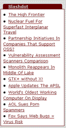 So if any of you people can explain how to divine the slashdot headlines outta their rdf file (or outta any other site that lists their headlines in this format), please leave a comment and tell me how scrubby I am.