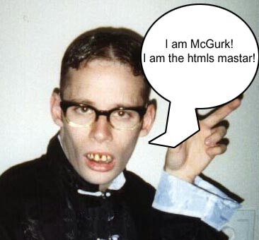 The gentlemen to your left there, McGurk, has graciously offered his html training services to me. If you look at the comments for my update on the 30th, you'll see him spouting his wisdom. I'm not even sure what an 'interdependant menuing system' is, but I'm sure once he's done with me I will be the bestest at the htmls as ever anyone ever was. And he sure is a looker too!