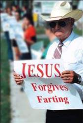 oh and i thought i would put a picture here because it is a good picture of the old man who lives across the street. he holds the sign to tell people that jesus forgives farting and that's good. because i had a burrito for supper tonight and you know what that means.