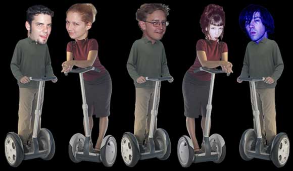 The staff of glitch13.com rocking their brand new geek-mobiles! OK, Ms. A may not have ever posted, but she's got an account, whether she likes it or not. As far as scooter-mania goes, To quote Tycho from yesterday's episode of Penny Arcade, "IT was being "revealed" today, even though almost everyone I know thought it was a scooter, which it is. An extremely fancy scooter which will cost three thousand dollars, yes, but we're still squarely situated in Scootersville." That about sums up my impression. Yay, cool, a bad ass scooter. Even sounds funny coming outta my own mouth.