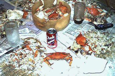 here's a pic taken of the spread when we had berled crabs over at my aunt jo's place. i know none of y'all down there really are astounded by this sight because you've all seen it occasionally. this is more for the benefit of mister fix and miss a. and also for their benefit i'll add this commentary: yes miss a, they were very good. and yes mister fix, looking at this picture helps me understand why you don't like seafood.
